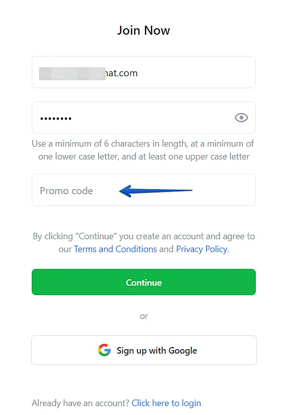 2. Now simply typy your promo code in the indicated field and press "Continue".