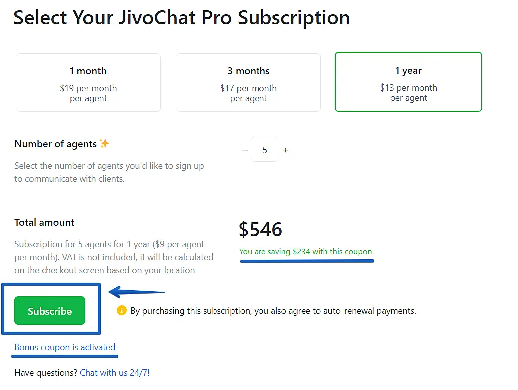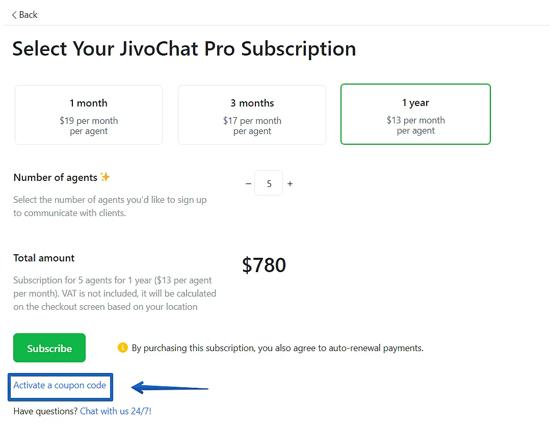 Discount codes are used to apply discounts on the value of JivoChat Pro licenses during the purchase. If you have a discount code in hands and wants to use it during the checkout of JivoChat Pro licenses, please follow the steps below.