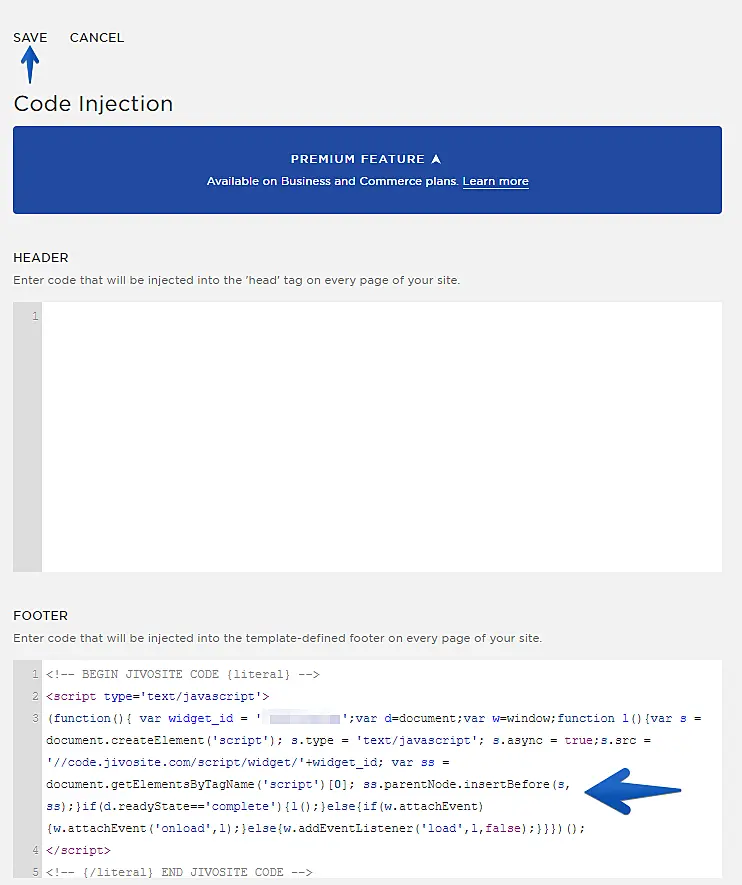 Insert the JivoChat code on the Footer section and click Save on the top left corner.