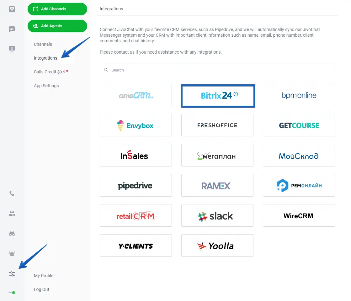 Next, open your JivoChat application and go to Manage > Integrations, then click on Bitrix24.