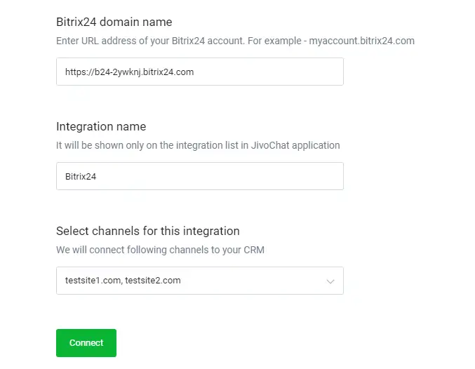 That's all. Bitrix24 is connected to JivoChat. After connecting, the integration will appear in the "Connected integrations" list, where you can change its settings and view the event logs.