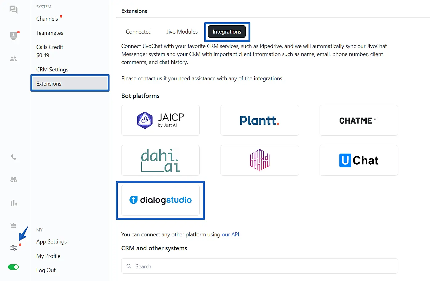Copy the token and go to the JivoChat app > "Manage" > "Extensions" > "Integrations" and select "Tovie DialogStudio".