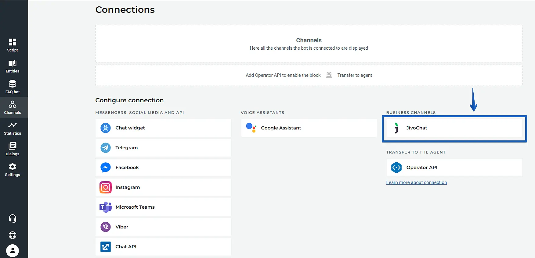 When it's done, go to "Channels" and select "JivoChat" under "Business channels".