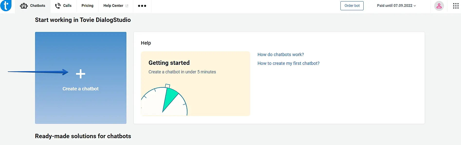 After that, add a new chatbot in the Tovie panel. You can either use a template or create your own.