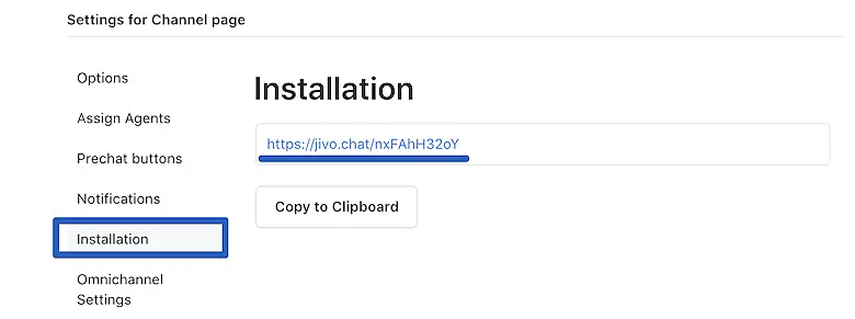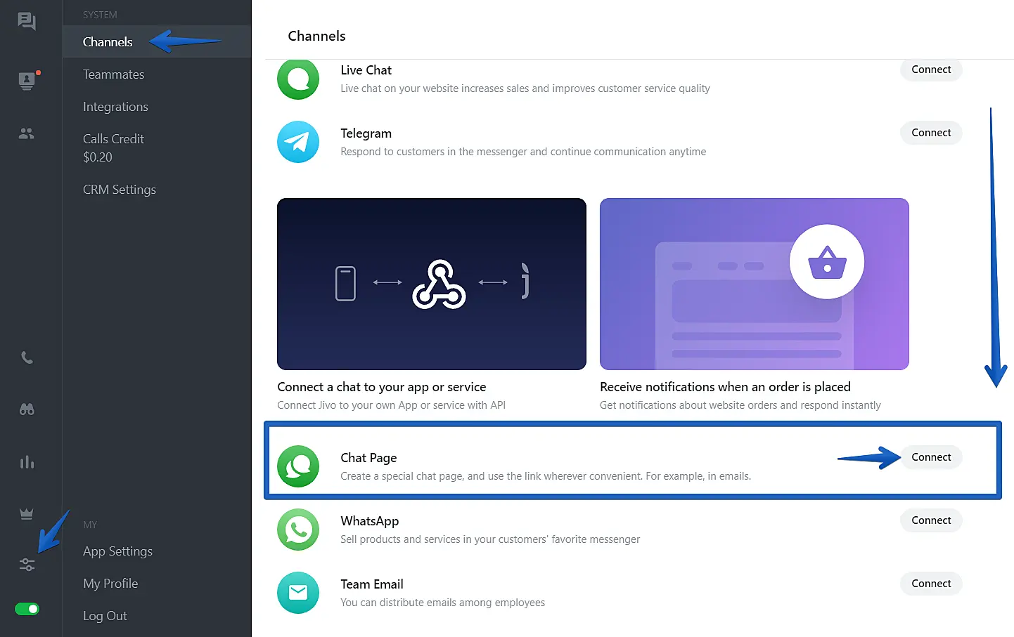 To create chat page go to JivoChat and navigate to Manage > Channels > Chat page and click "Connect".