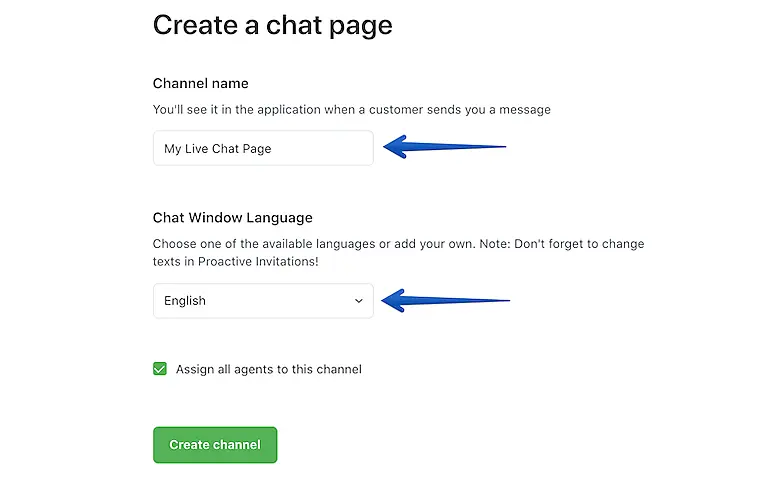 Give the channel a name (visible to agents), select chat window language and click Create channel.