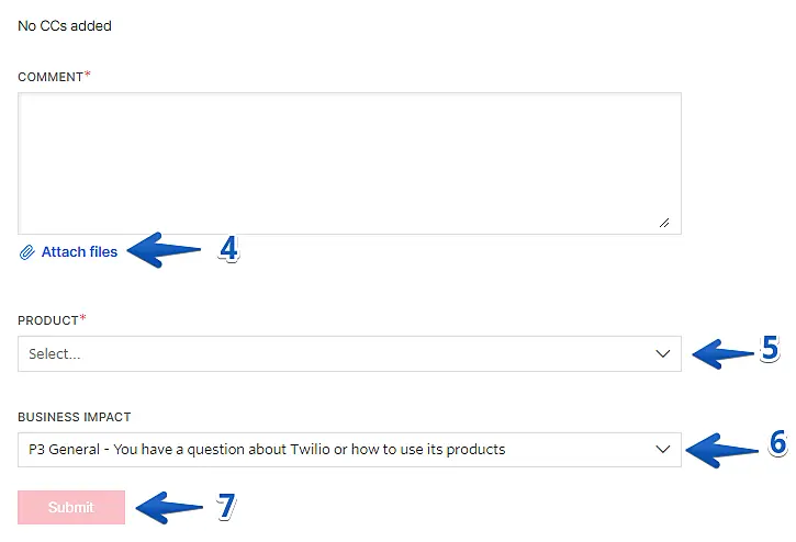 - Business Impact: In this last field you will select the priority level that that resolution has for your business. If you have just one question about Twilio or questions about how to use its products, please select "P3", if your Twilio configuration is not working properly or intermittently, please select "P2" and if your configuration is experiencing a complete outage, bug, directly affecting its operation, select "P1".