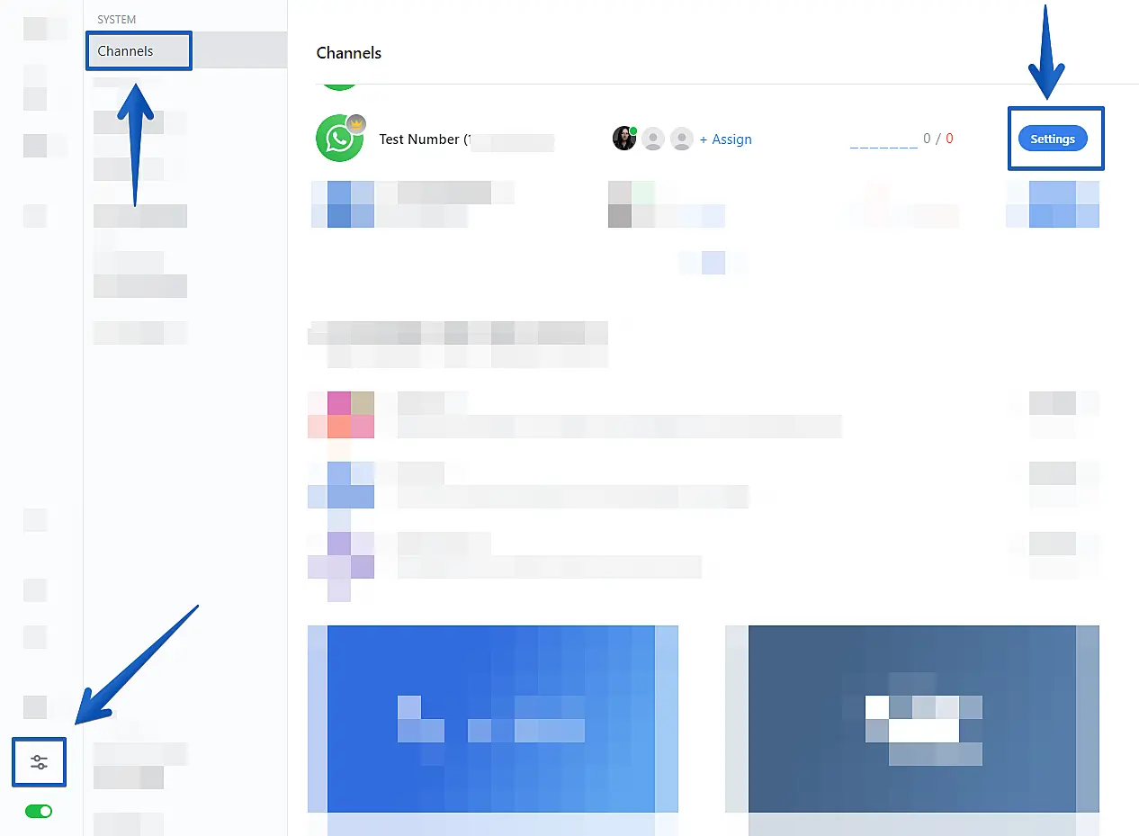 Log in to your JivoChat app -> Click on "Manage" -> "Channels" -> Locate your WhatsApp channel and click on "Settings" (in blue)