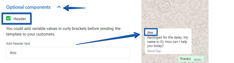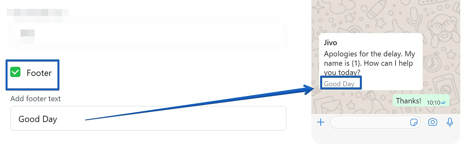 The second is the footer, where you will insert a name that will appear at the end of the template message, as the image below demonstrates: