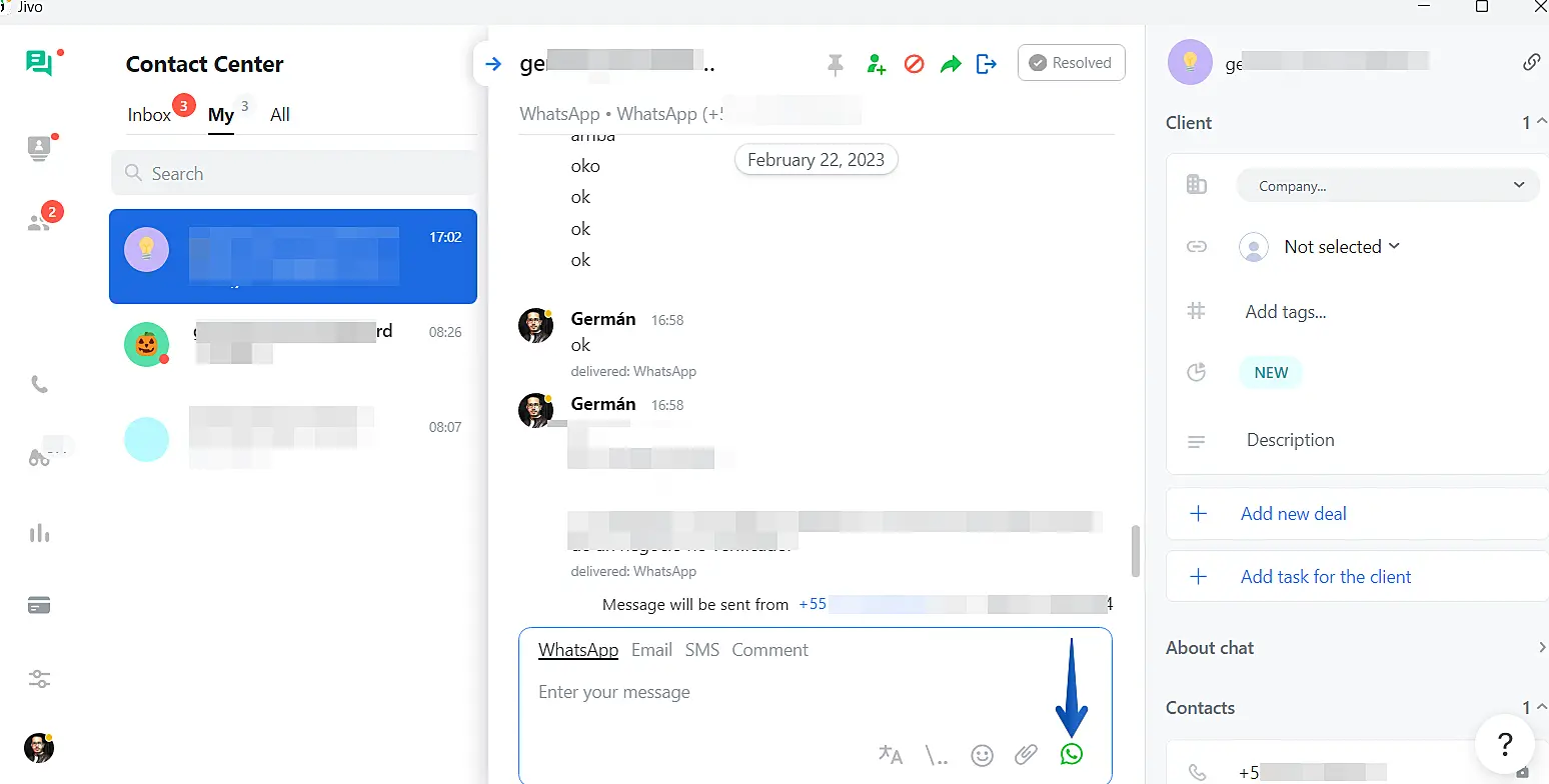 Now, template messages from the JivoChat side will be automatically displayed in the menu to be sent once they have been approved in your meta profile. During a conversation go to the WhatsApp icon located at the lower right side of the chat in the desktop app: