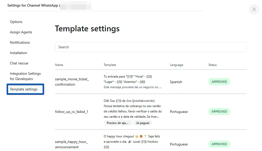 You can also check your templates status from JivoChat. In JivoChat we will show if the templates was approved or rejected.